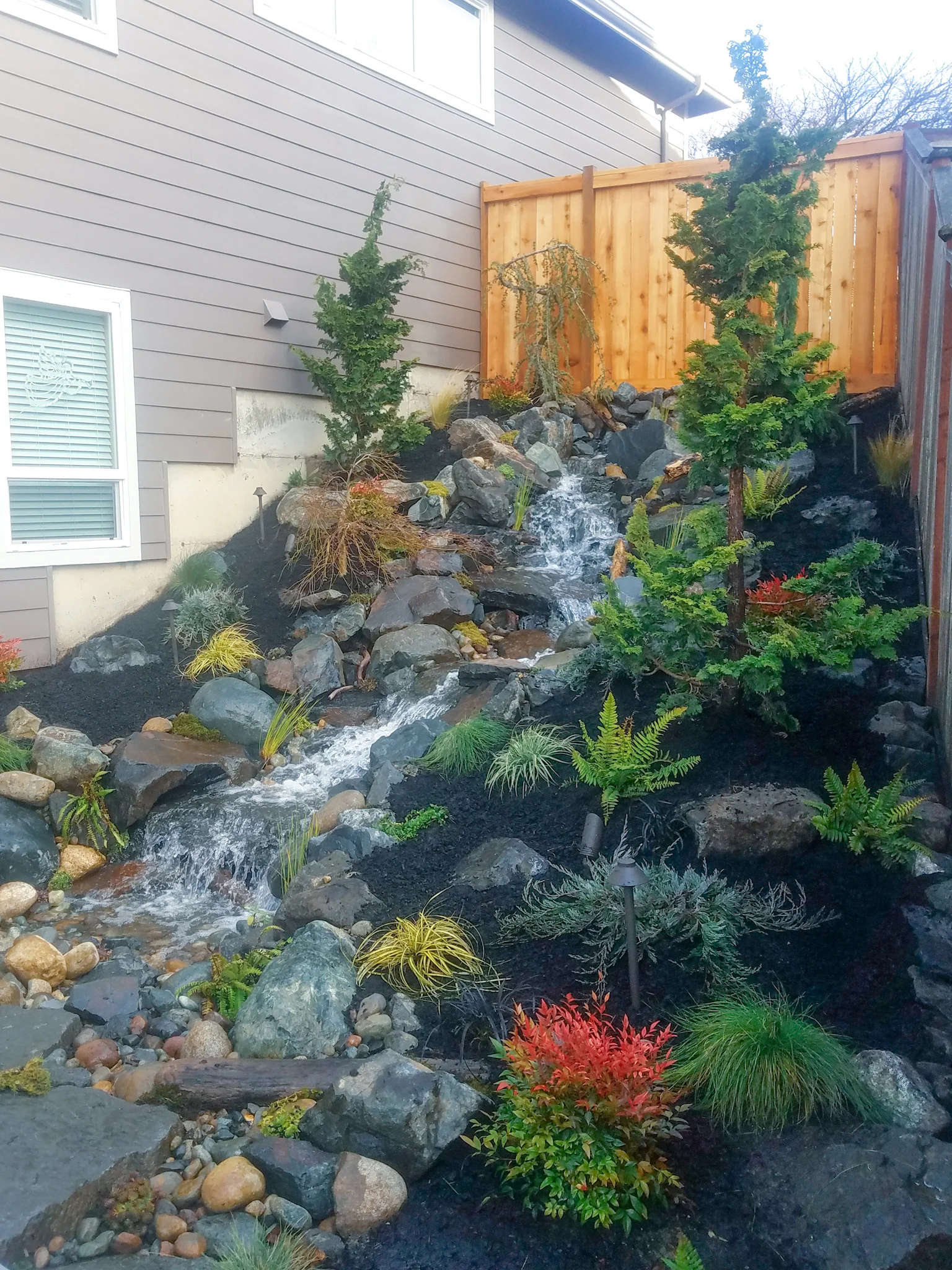 We used a mix of grasses, maple and evergreen trees, succulents and deciduous shrubs to complete the look.