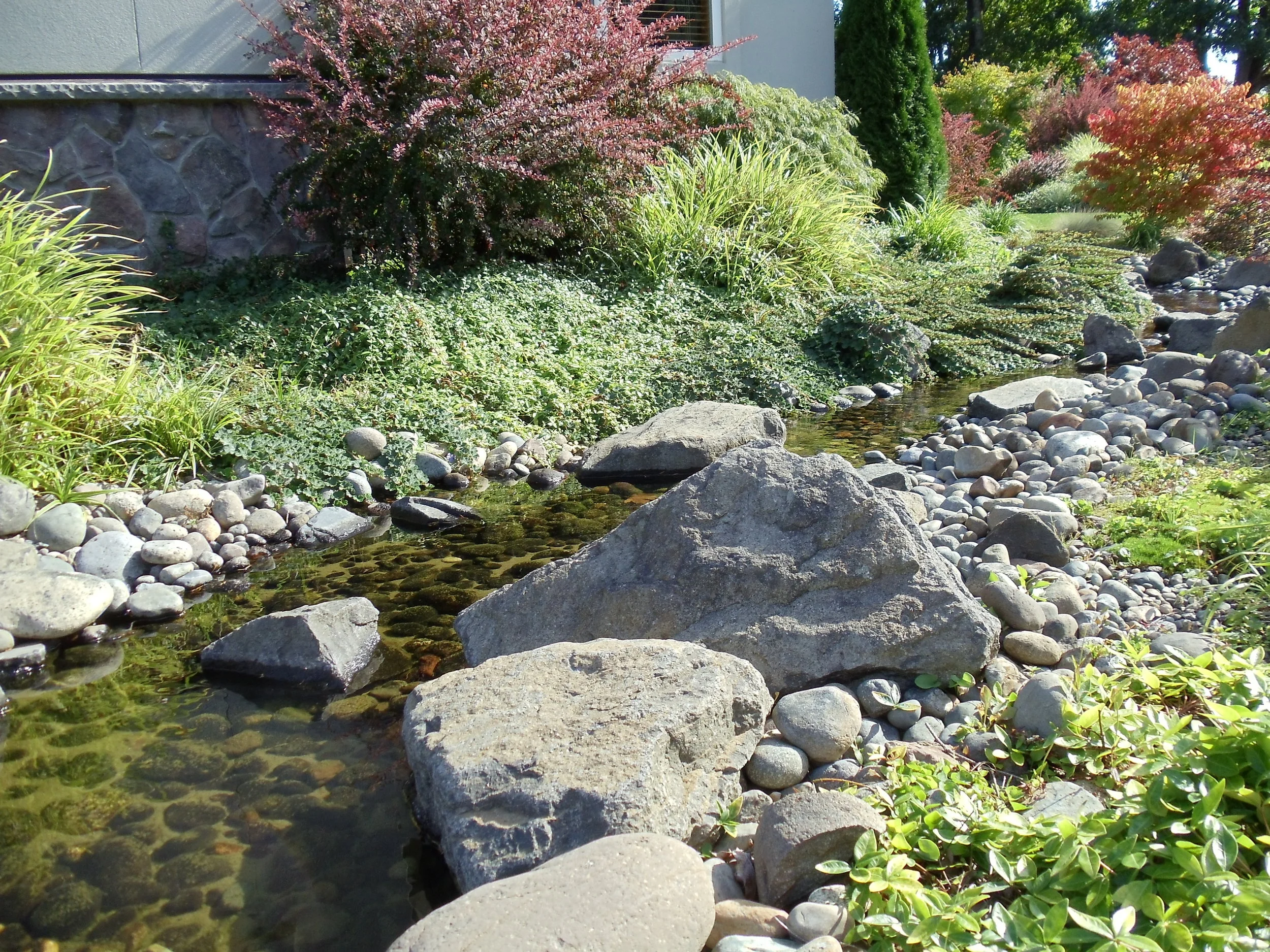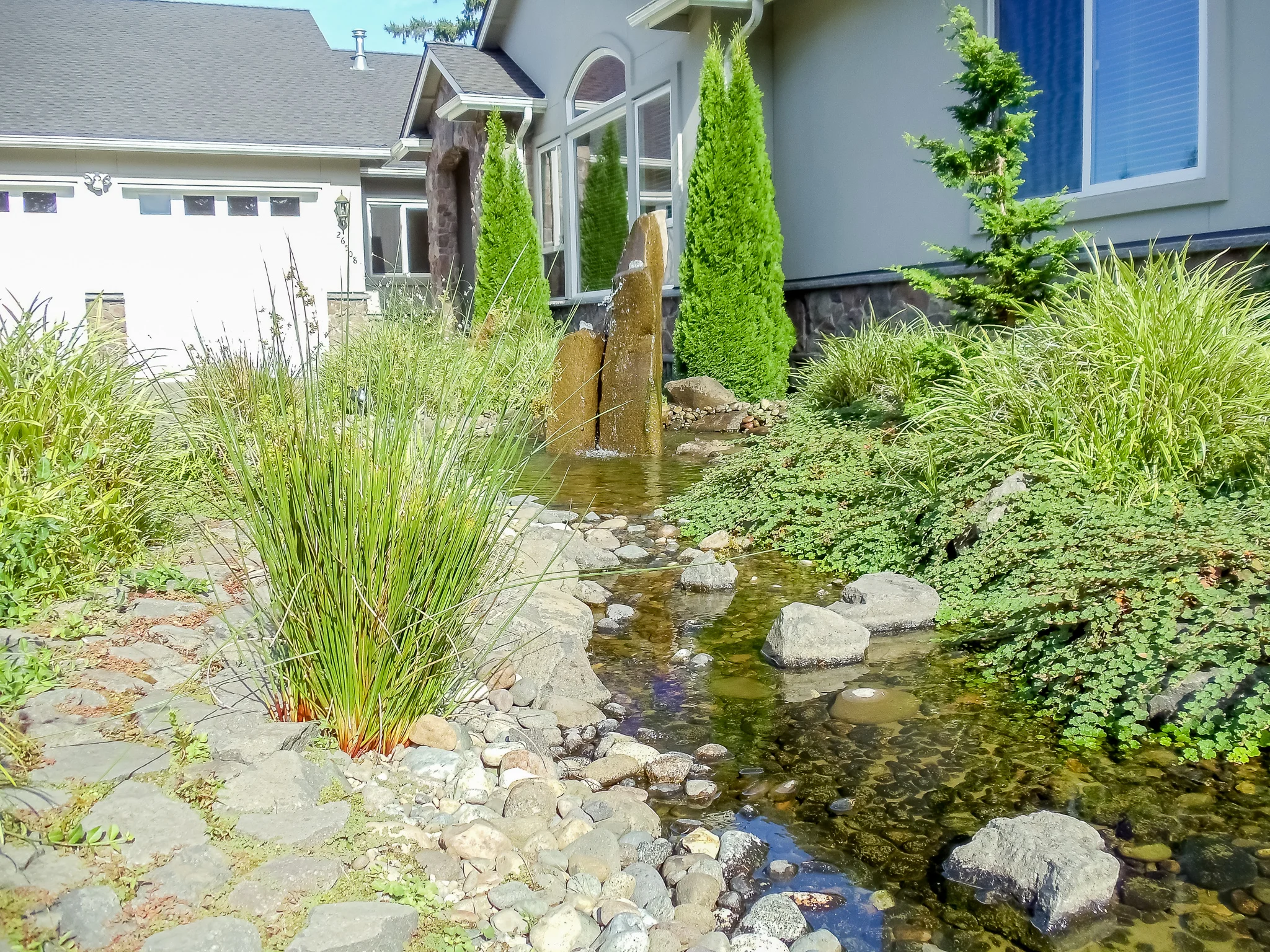 “The water feature is a self cleaning system, designed for ZERO maintenance for the homeowner. It wraps from the front of the house to the back, turning into a waterfall into a pond.~ Chad”
