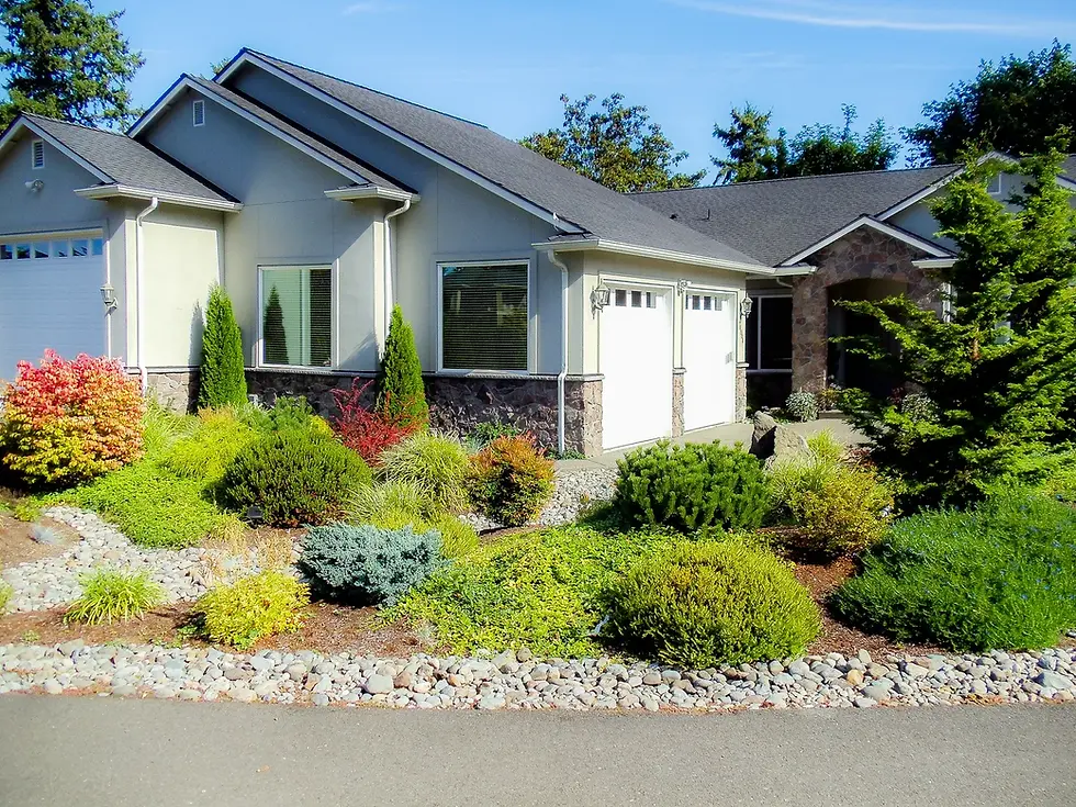 The landscaping at the front of the house was designed to be low maintenance but full of color. Grasses, trees and shrubs that look beautiful year round.