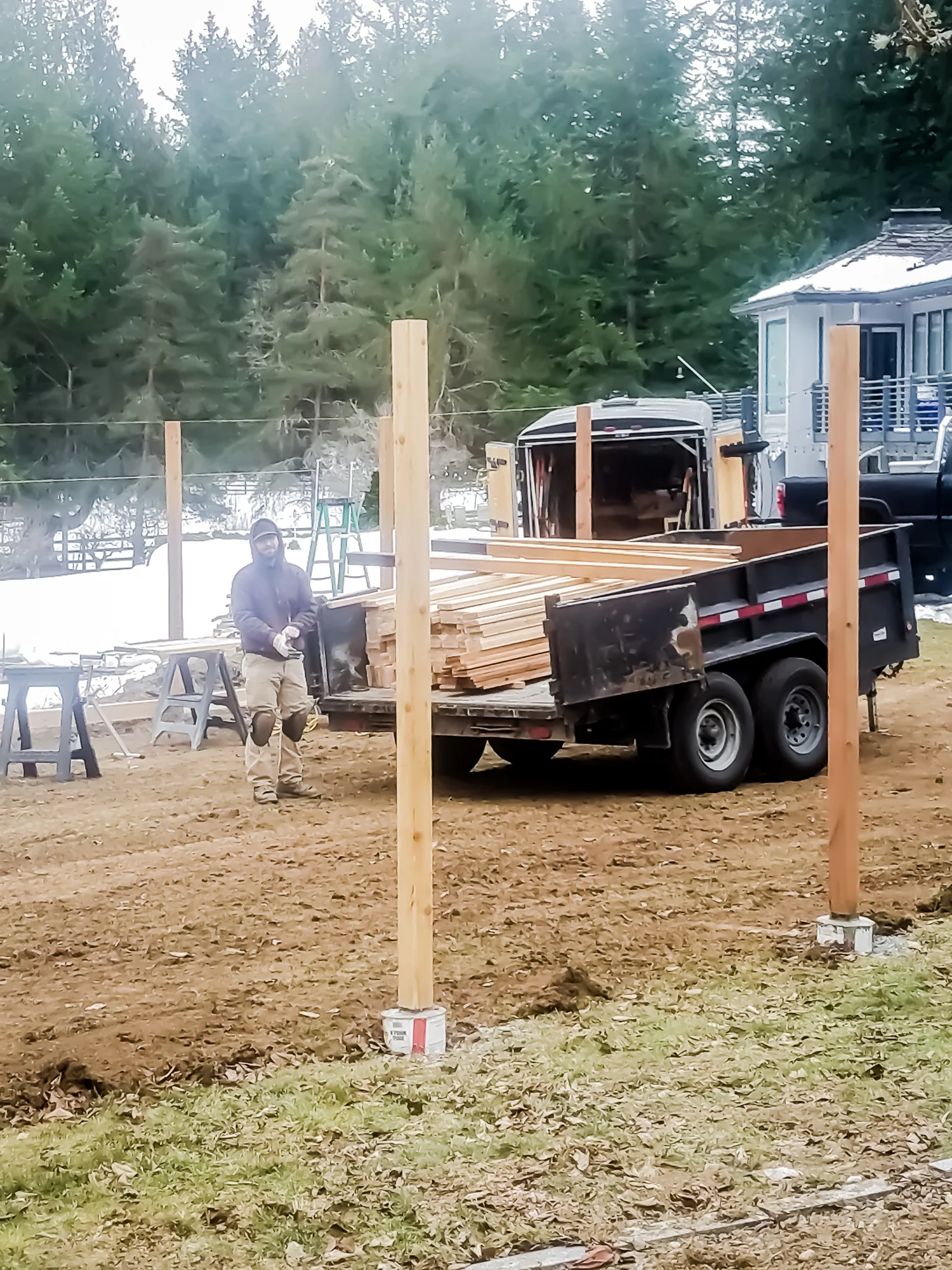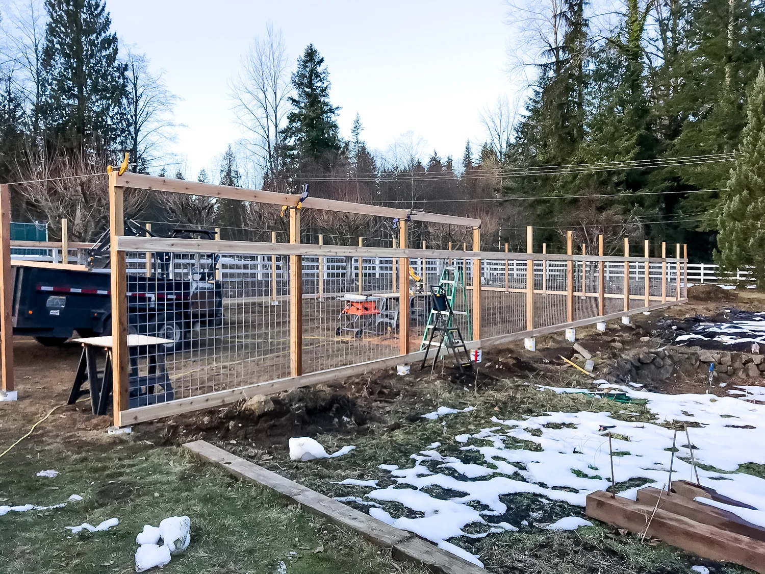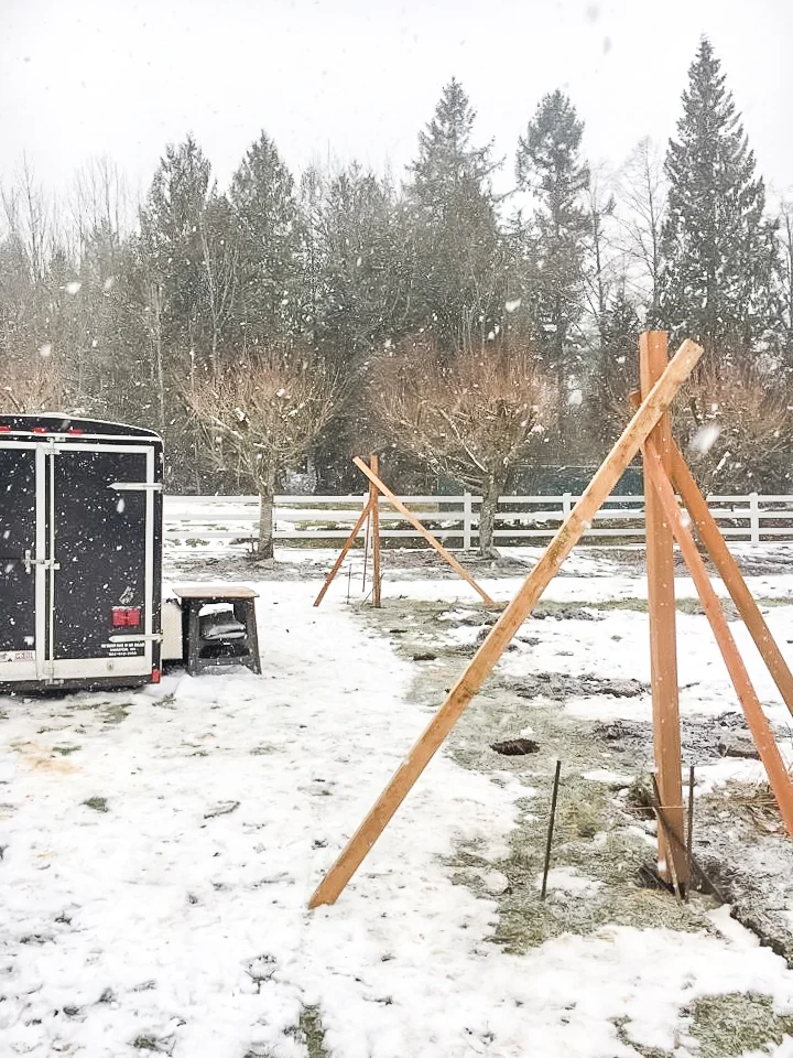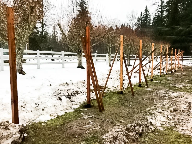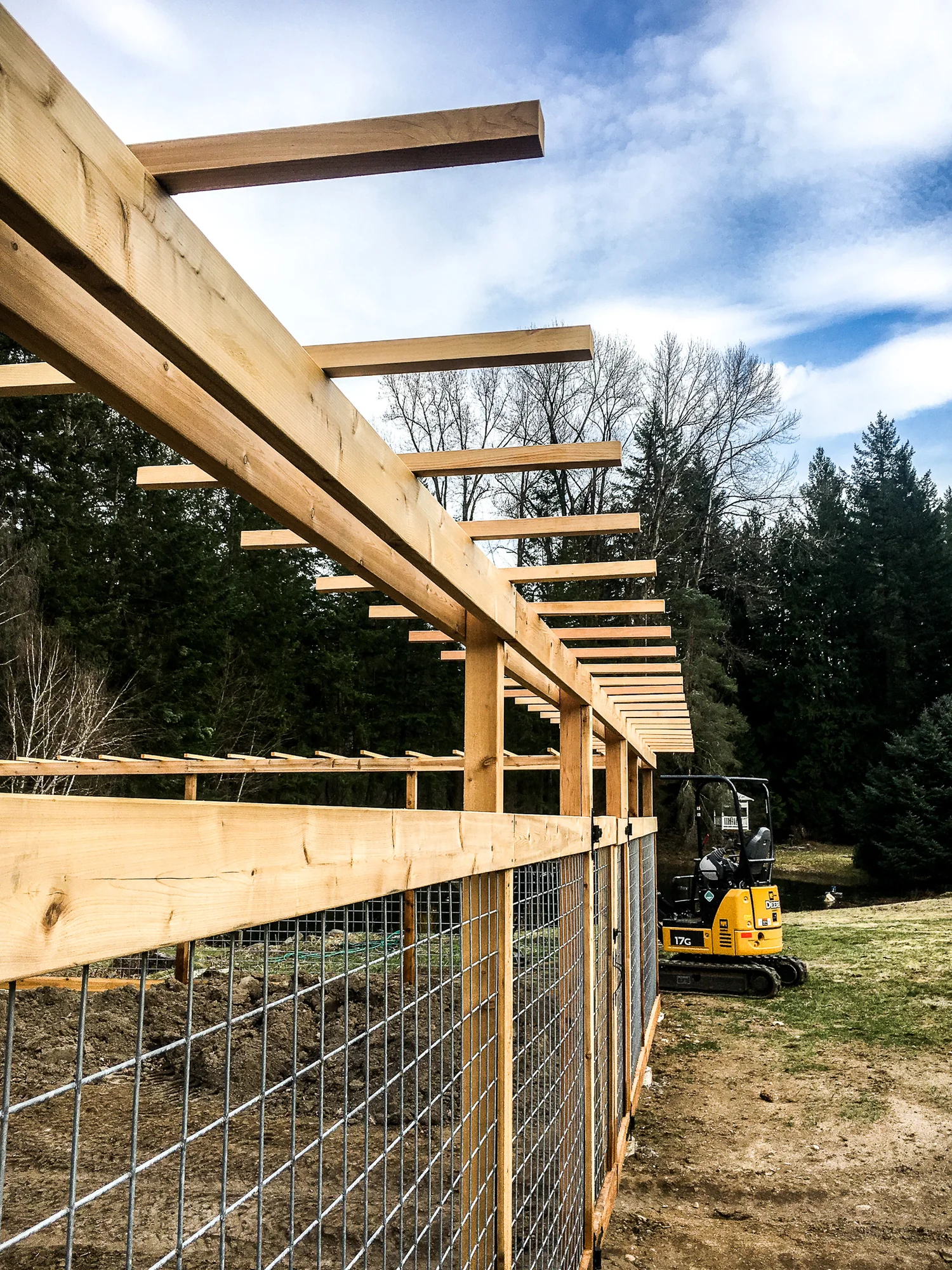 Progress progress progress… Thankfully we have the equipment needed to penetrate the frozen ground to concrete the posts in. Getting everything level on a sloped ground required a lot of engineering on our part. Making sure the posts and trellis was level all the way around was quite the task.