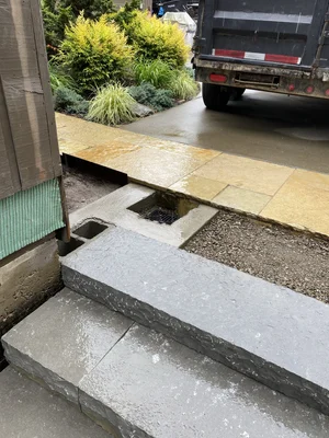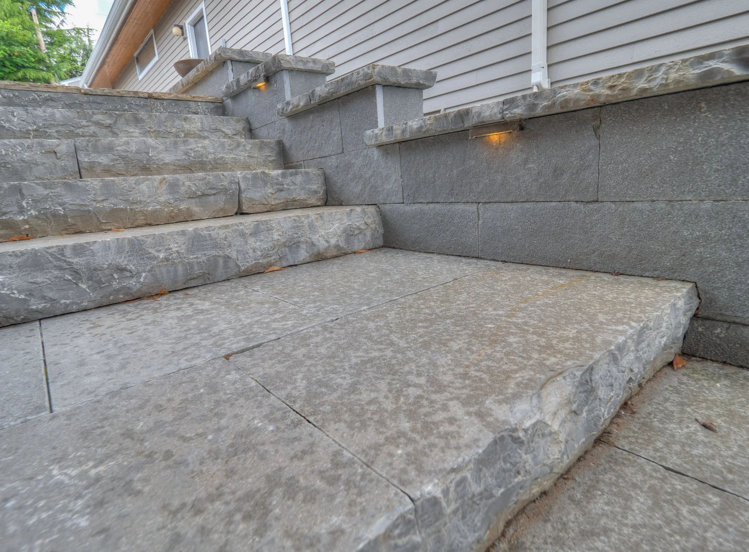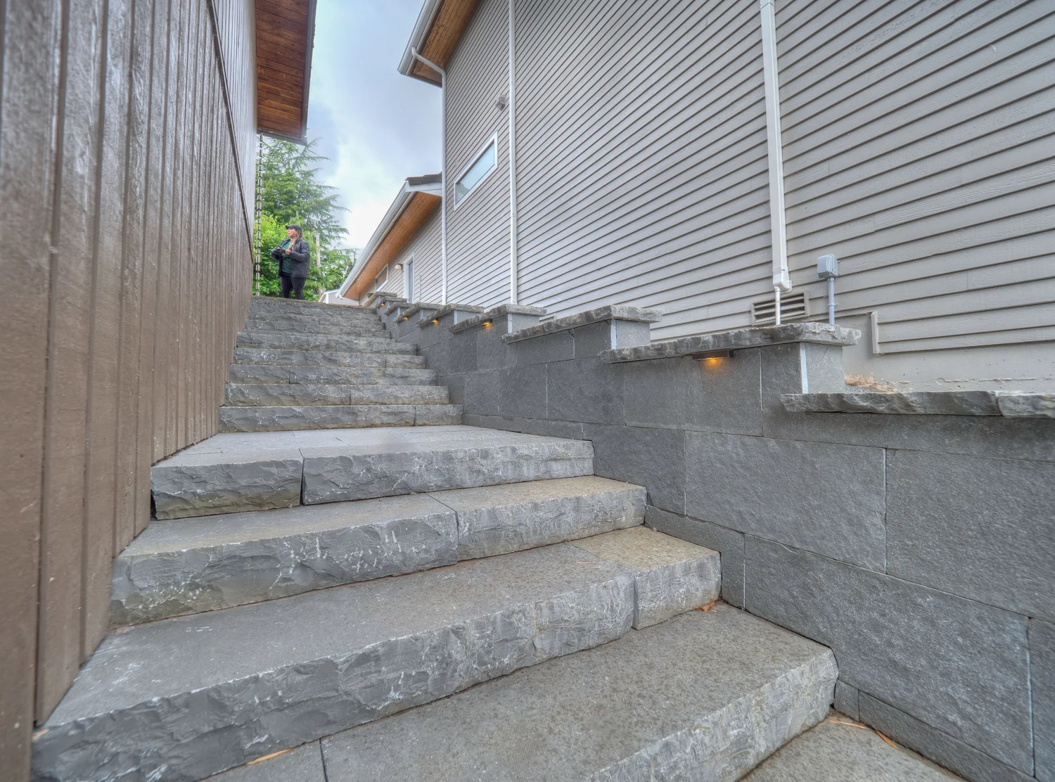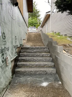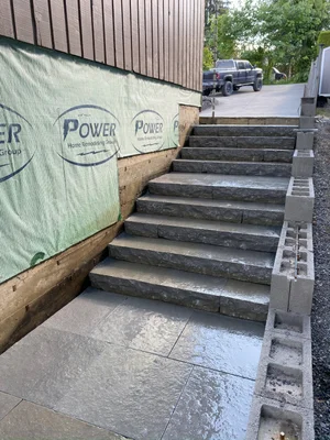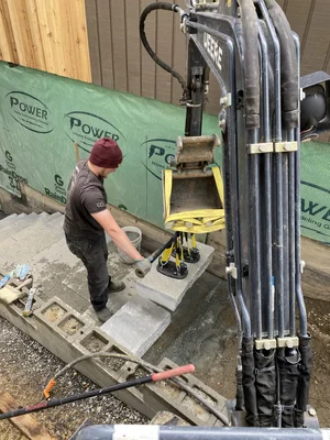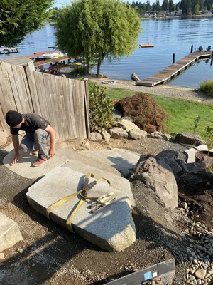 Each stone stair riser weighs hundreds of pounds and is strategically placed by hand and excavator using extreme power suction grips…
